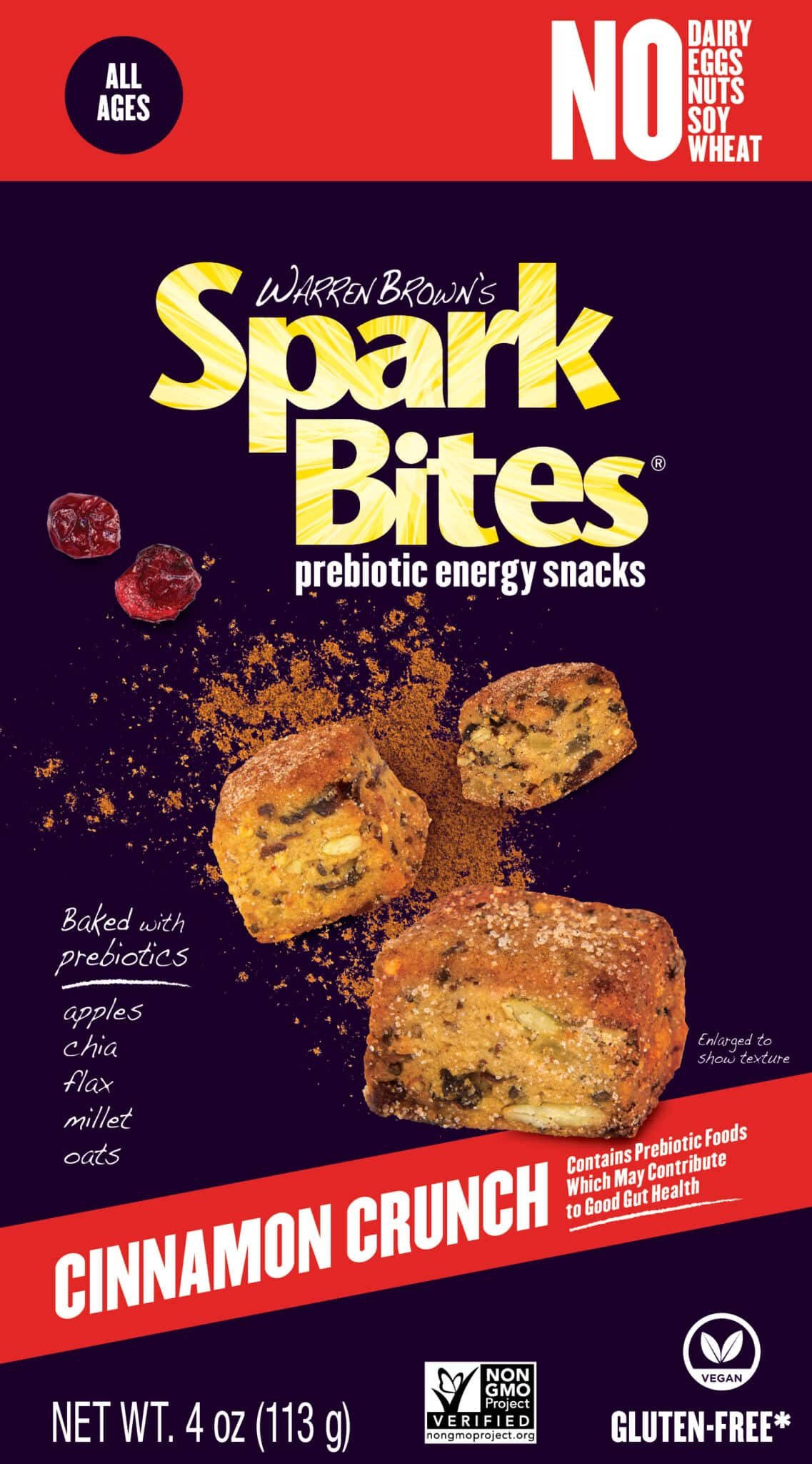 Warren Brown’s Spark Bites — Artisan manufacturer of innovative bakery products and consumer packaged prebiotic energy snacks. Their products are manufactured in a facility free of fish, crustacean shellfish, sesame, and mustard.
